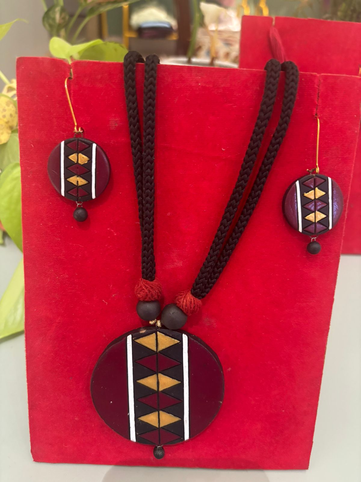 A hand-painted terracotta jewellery set featuring a vibrant neckpiece and matching earrings. One design, one piece — crafted as a limited-edition collectible. Available only till stock lasts.