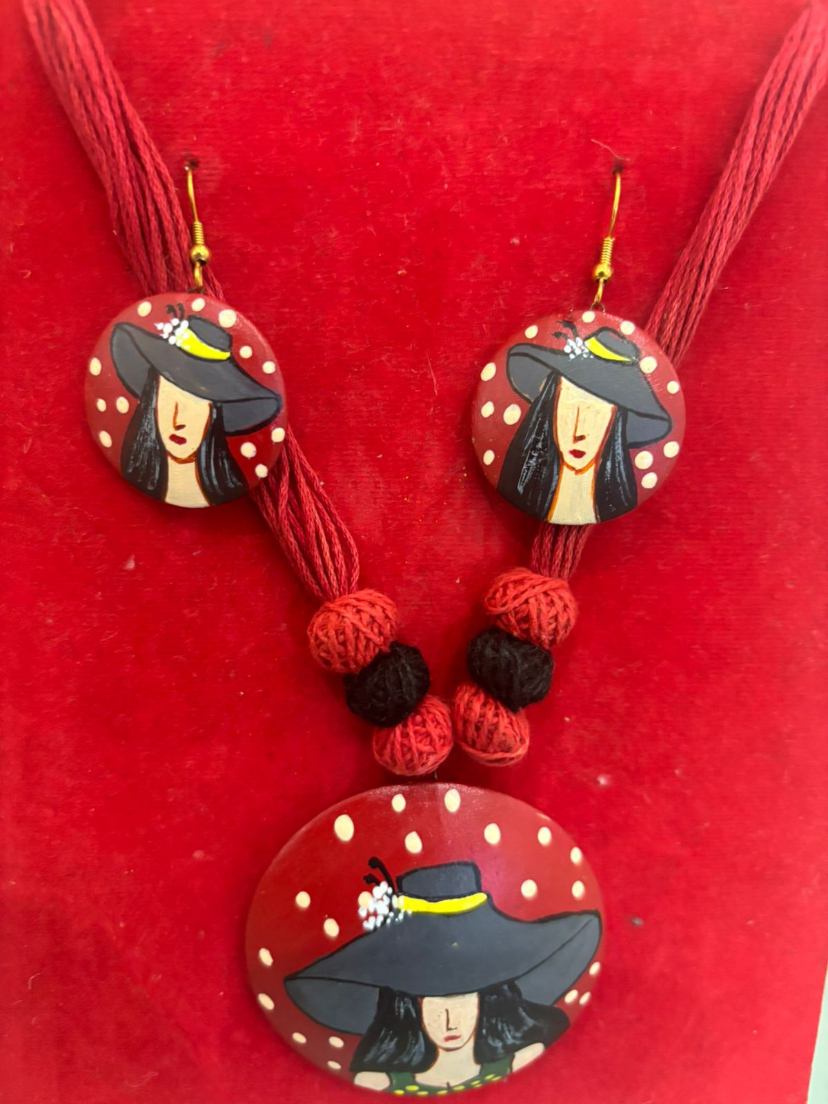 A hand-painted terracotta jewellery set featuring a vibrant neckpiece and matching earrings. One design, one piece — crafted as a limited-edition collectible. Available only till stock lasts.