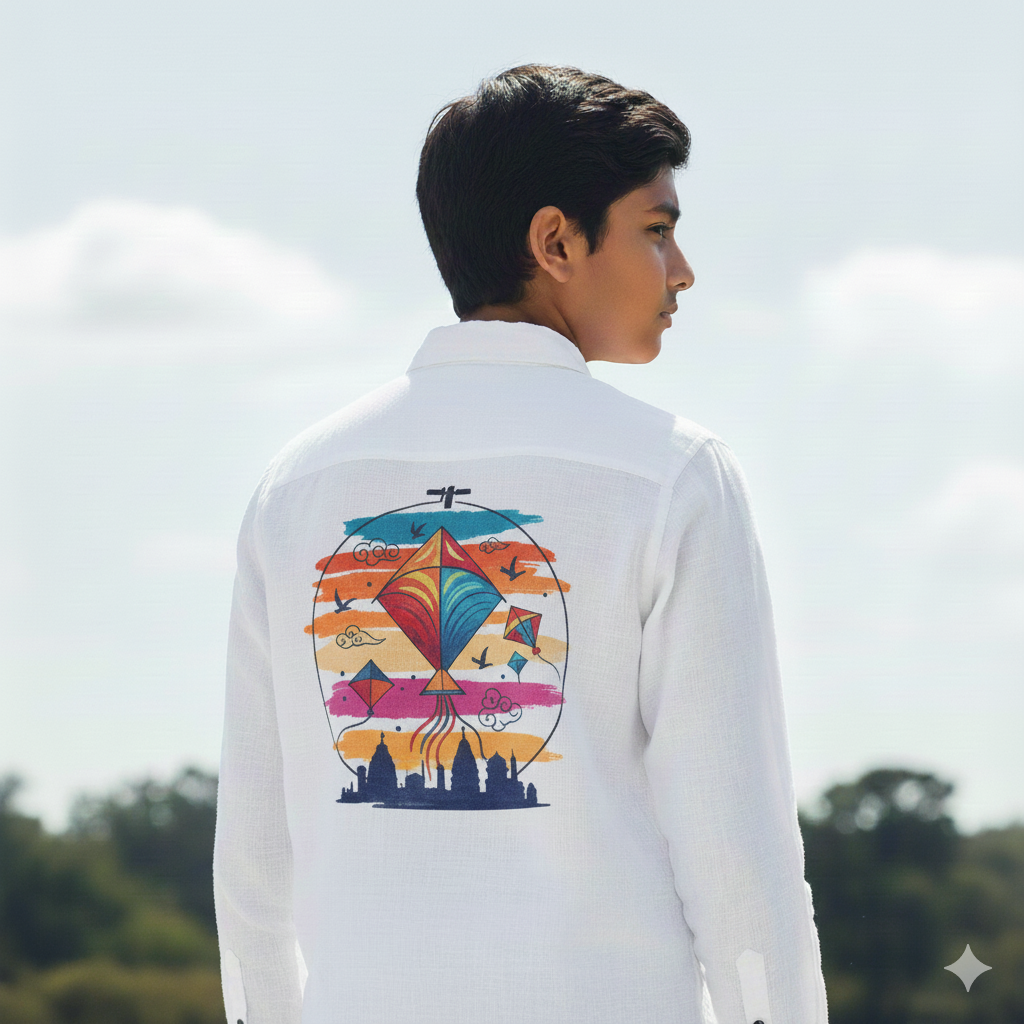 Capture the magic of a festival evening with our "Udaan" shirt. The back features a vivid, sunset-hued handpainted graphic of kites soaring over a classic city silhouette, blending traditional inspiration with modern design. Made from high-quality, breathable white cotton, this shirt offers a lightweight feel that's perfect for warm-weather celebrations or casual weekends.