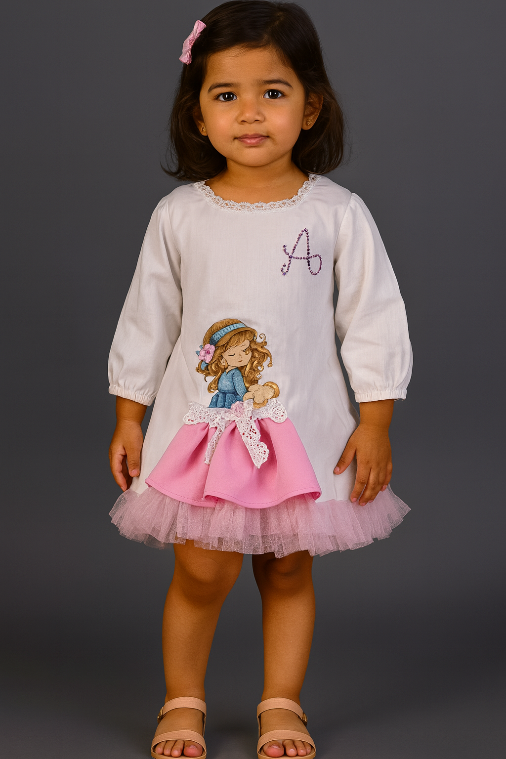 A charming white cotton dress for little girls, featuring a cute doll motif and a layered pink bow with soft tulle detailing. Comfortable, breathable, and perfect for special occasions or everyday wear, this dress combines playful design with all-day ease.